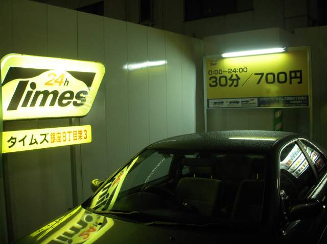 ①銀座のコインパーキング。高っ!!!! ②夜の歌舞伎座 & ポスター 来春、最終公演・・・