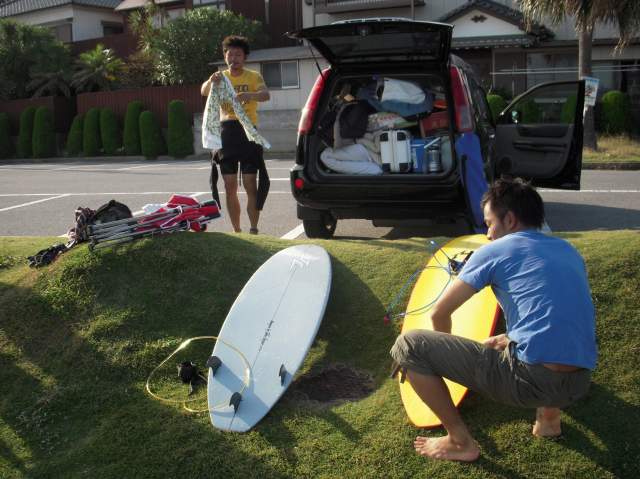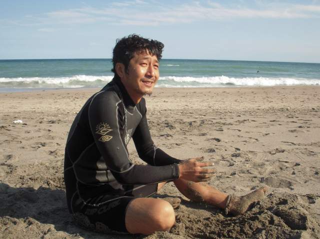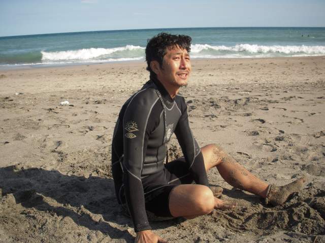 太郎さんのウェットスーツ、ボードを借りて・・・。サイズはピッタリ!