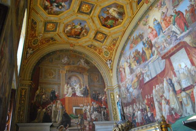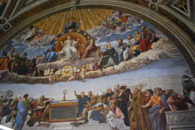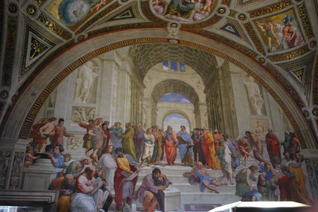 *右の絵はかなり有名な絵です。中央のオレンジとブルーの服を着た人物。左がアリストテレス、右がプラトンらしい。。。あと、ラファエロもすみに自画像を書いていたり・・・