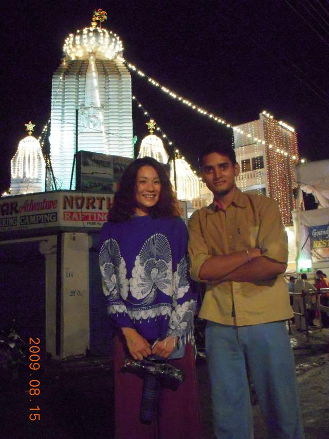 後ろは、お祭り会場の寺院。もの凄い数のライトアップ!!