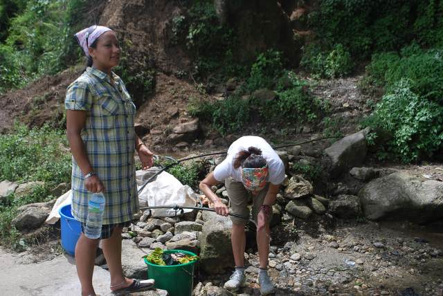 途中の湧き水で、休憩するtomocoとアユーシャ。