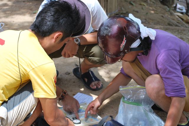 *左・・・バイクで、路地を駆け抜ける私達。 右・・水草会議を開いています。「この川に沿って北上して・・」
