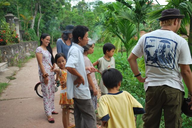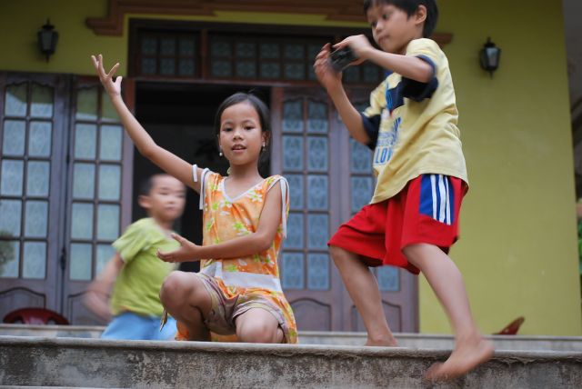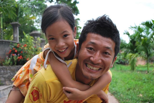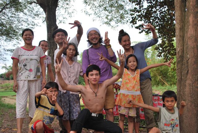 がんばる隊長の後ろで私達は、集まってきたベトナム人とたわむれていました。