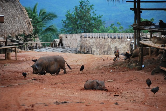 左:村の動物たち!豚・ニワトリ・犬・猫etc ※朝3時ぐらいからの大合唱は正直きつかった・・・