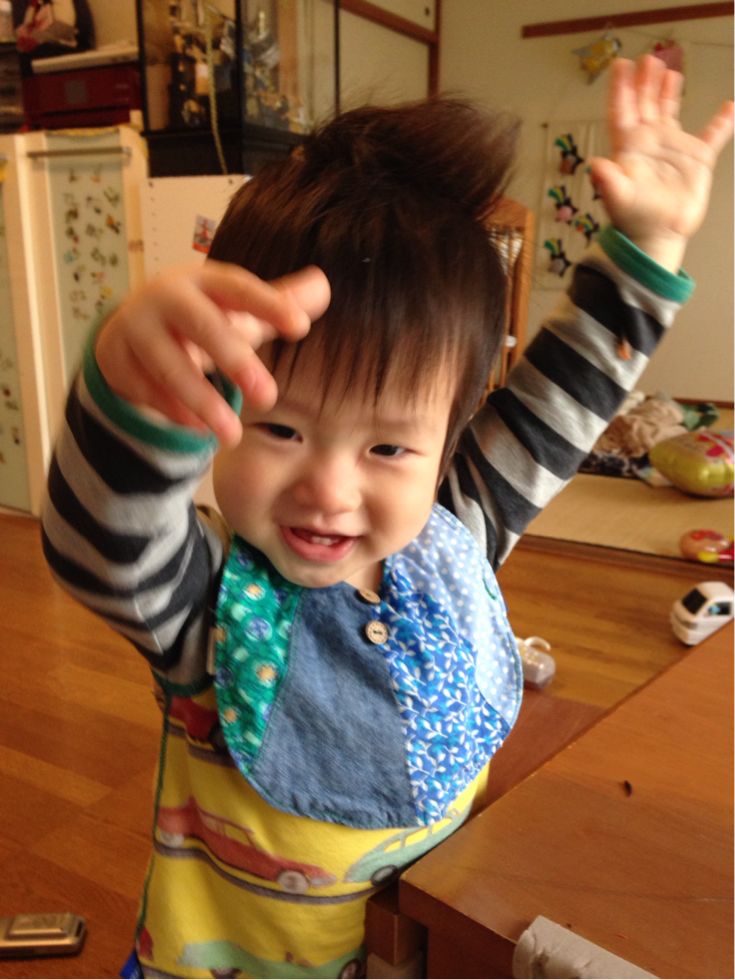 お兄ちゃんの幼稚園で、「頑張ります!エイエイオー!」をするので、朝陽にやって見せたら、え〜、えー!といって、腕を振る!!