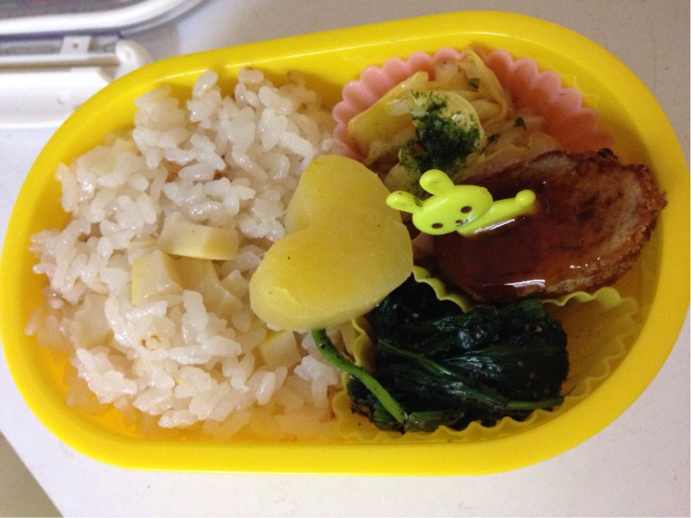 お弁当。ほうれん草の胡麻和え、サツマイモ、メンチカツ、キャベツ炒め