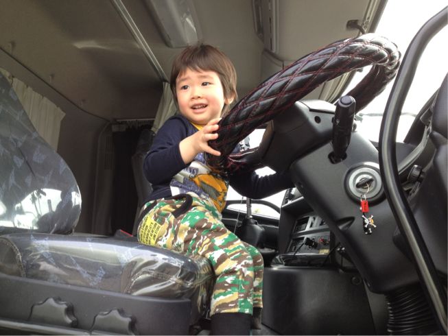 ミキサー車。大きなハンドルと「左に曲がりまーす♪」の声にゴキゲン♪